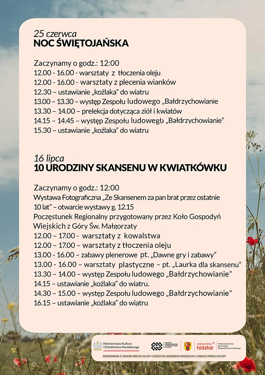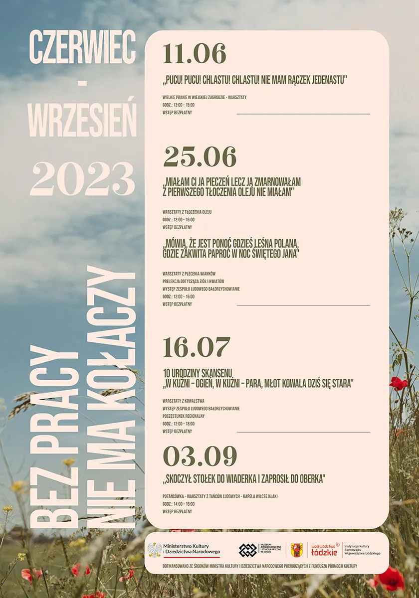 W 2023 r. Łęczycka Zagroda Chłopska w Kwiatkówku kończy 10 lat! W ramach projektu "Bez pracy nie ma kołaczy" planowane są działania edukacyjne - cykl jubileuszowych warsztatów tematycznych obrazujących prace gospodarcze w zagrodzie wiejskiej z okresu dwudziestolecia międzywojennego. Poprzez pokazy i warsztaty ma wolnym powietrzu pragniemy przypomnieć dawne codzienne zajęcia w domu i zagrodzie, podtrzymując tym tradycje kultury wiejskiej.