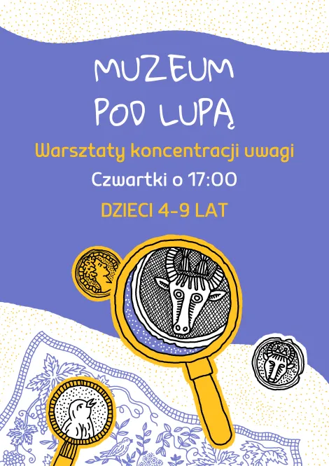 „Muzeum pod lupą” to warsztaty koncentracji uwagi dla dzieci w wieku 4–9 lat. Rozwijają koncentrację, uwagę i umiejętność skupienia. Wszystkie zadania są bezpośrednio związane z ekspozycjami i zbiorami naszego muzeum. Zajęcia łączą zdobywanie wiedzy z ćwiczeniem uważności i odbywają się w niedużej, kameralnej grupie.