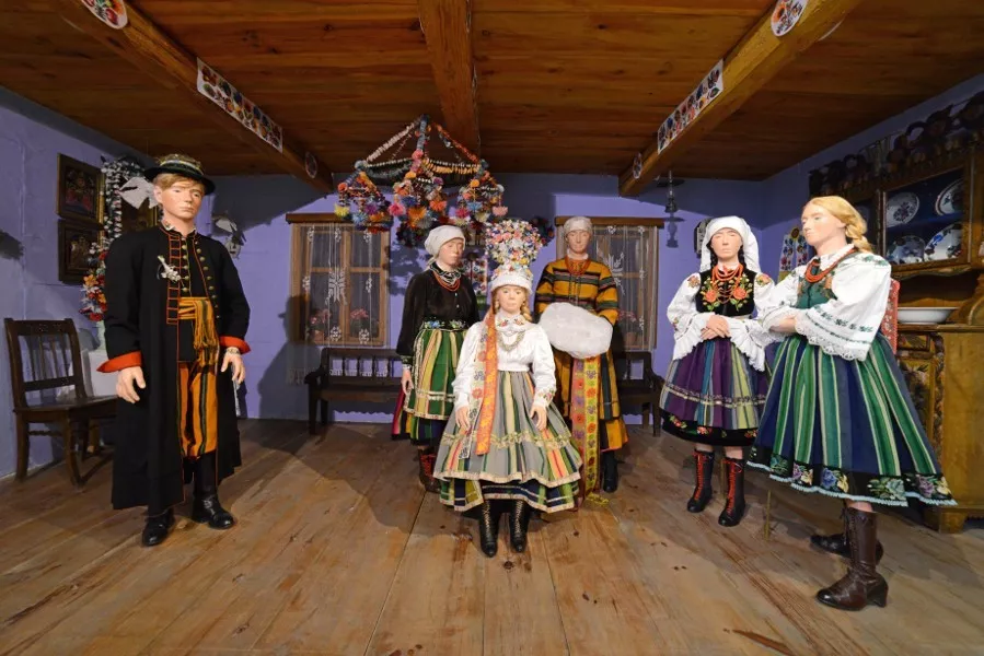 Tradycyjne wesele wiejskie było zespołem obrzędowym, na który składały się następujące elementy: zwyczaje przedślubne zakończone zaręczynami, ceremonia ślubna w kościele oraz uczta weselna o bogatej, rozbudowanej strukturze. Finalną częścią wesela było obrzędowe wykluczenie panny młodej z grupy dziewcząt i przyjęcie jej do grona kobiet zamężnych. Odbywało się to w sposób symboliczny, poprzez zdjęcie wianka i włożenie czepca - nakrycia głowy mężatek. Ten właśnie moment, zwany oczepinami, przedstawiony jest na wystawie jako fragment wesela łowickiego, odbywającego się w domu rodzinnym panny młodej.