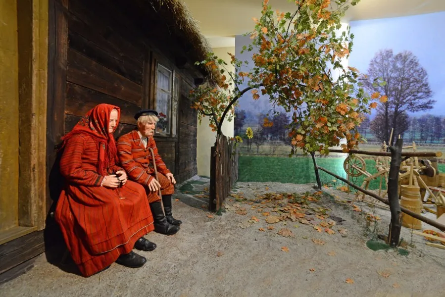 Okres starości, którego "wizerunkiem" na wystawie jest para staruszków w strojach sieradzkich odpoczywająca przed domem, był na wsi tak samo pracowity, jak całe chłopskie życie. Starsi członkowie rodziny wykonywali najczęściej rozmaite prace pomocnicze w gospodarstwie, ale najważniejszą ich rolą była opieka nad wnukami oraz przekazywanie im swej wiedzy i doświadczenia. Tak spełniało się ich życie.