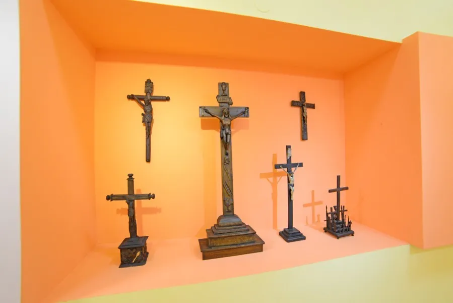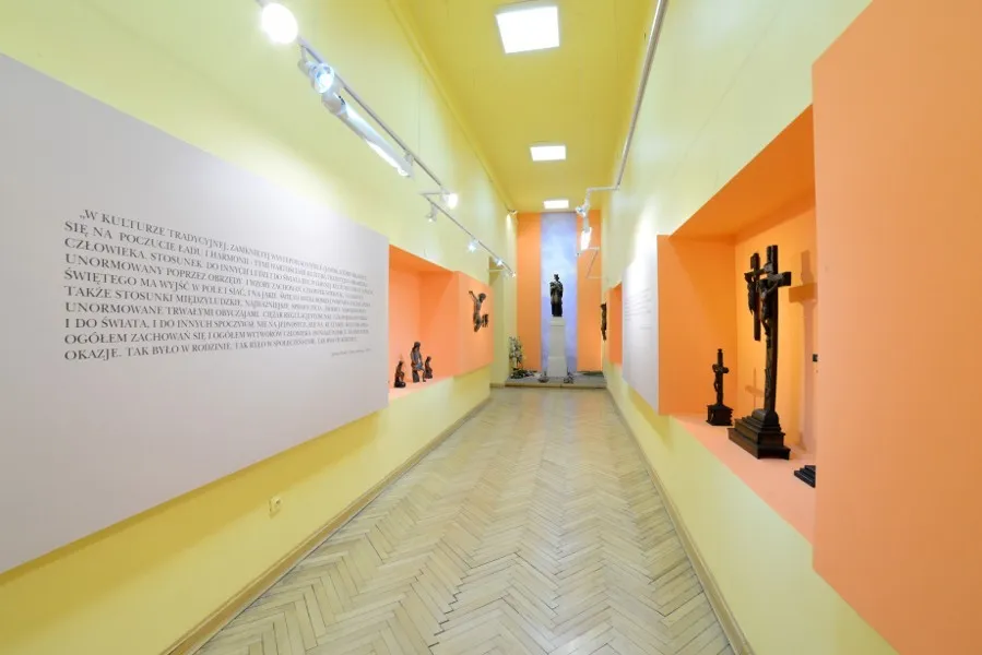 Na wsi od wieków dominującą rolę odgrywała religia. Przenikała ona całe życie chłopskie, zarówno indywidualne, jak i zbiorowe (wsi, parafii). Zewnętrznym przejawem kultu była ogromna liczba krzyży, figur i kapliczek przydrożnych, będących dziełami artystów ludowych. Dla podkreślenia znaczenia religii w społecznościach wiejskich, w korytarzu dzielącym sale wystawowe zaprezentowana została ludowa rzeźba sakralna sprzed 1939 r.