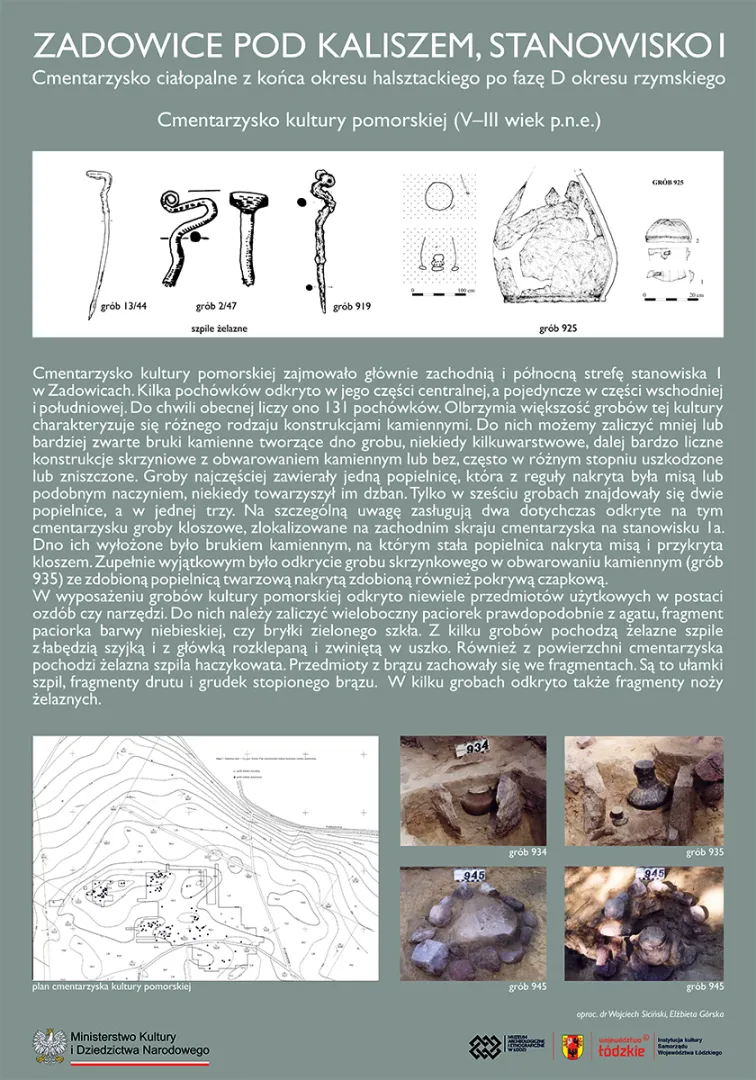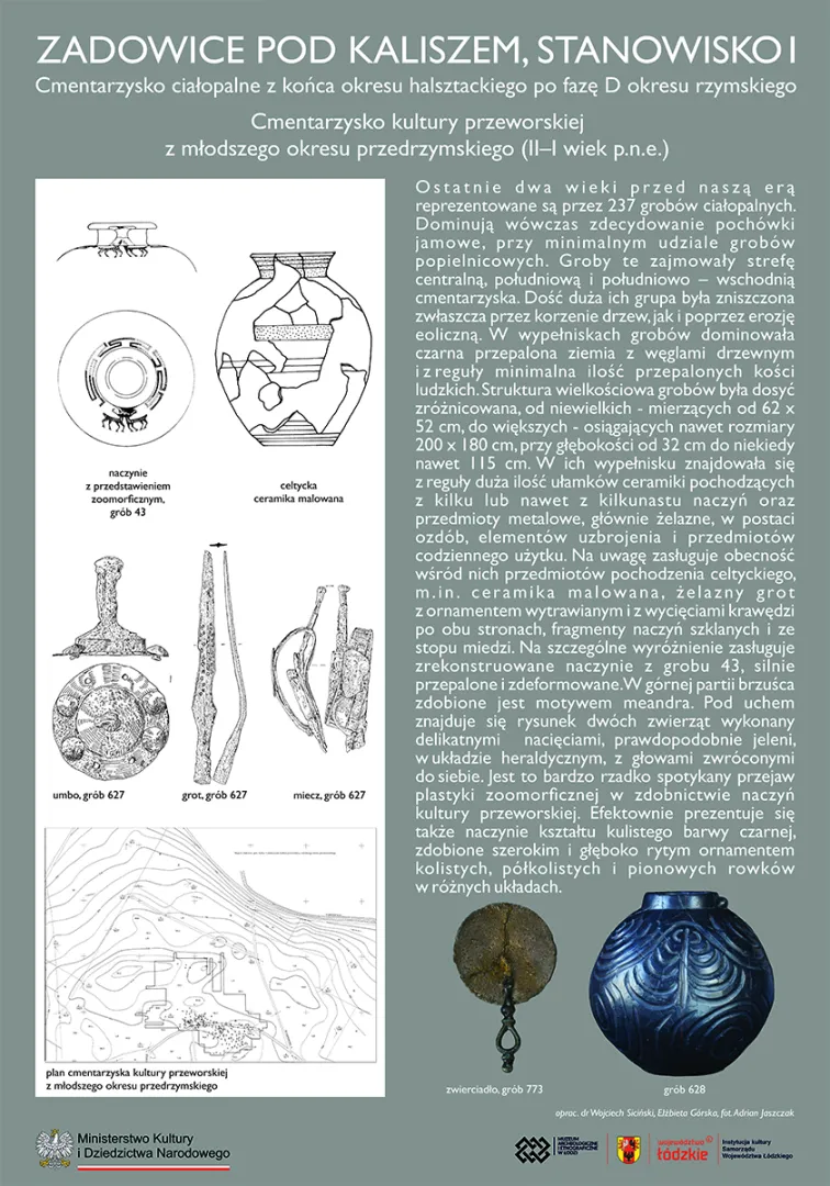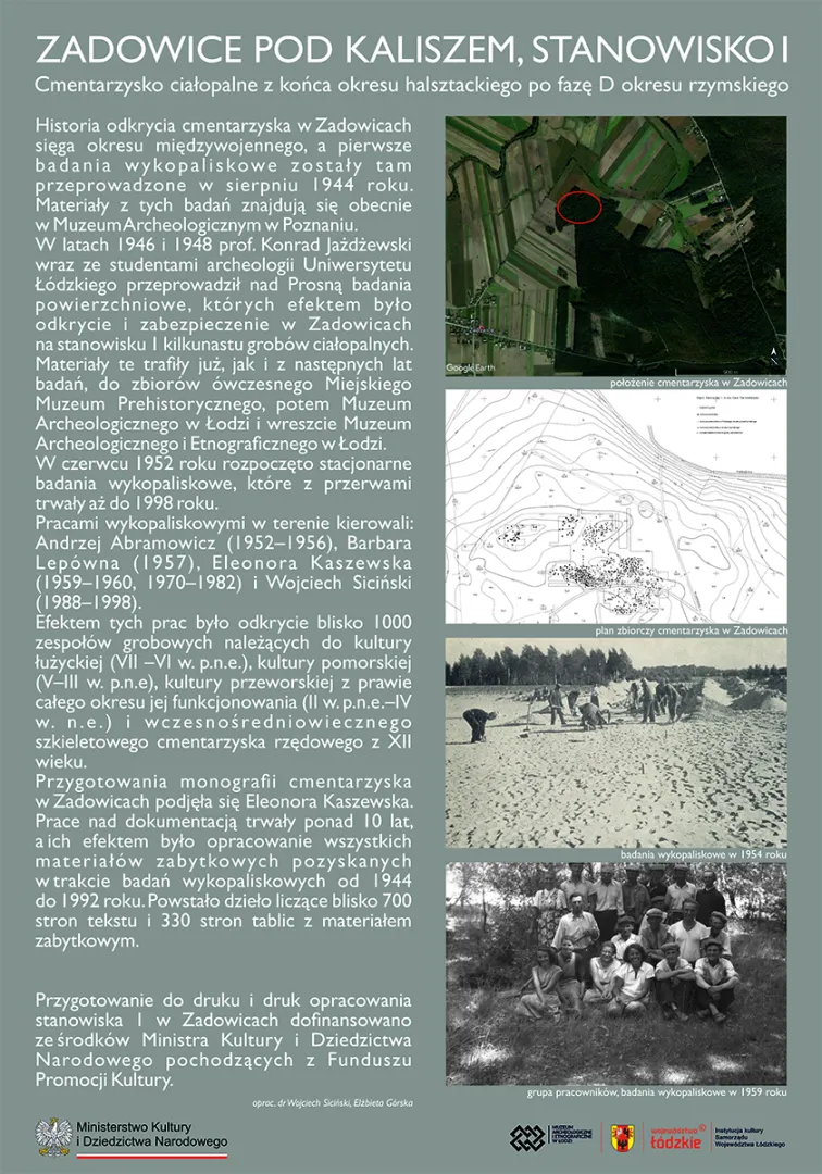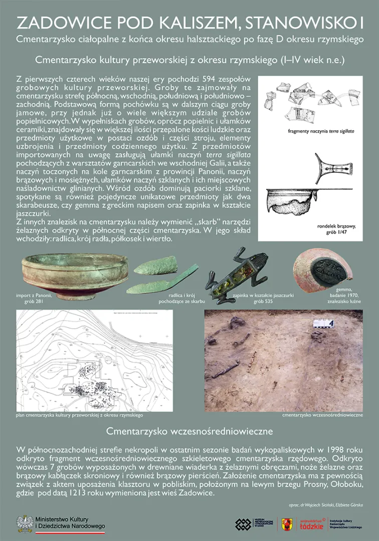 Celem zadania jest publikacja archiwalnego katalogu cmentarzyska w Zadowicach, pow. Kalisz, przygotowanego w języku niemieckim w latach 1988 - 1997 przez mgr Eleonorę Kaszewską. Jest to wielokulturowe cmentarzysko badane w latach 1952 - 1960, 1970 - 1982, 1991 i 1997 - 1998 przez Muzeum Archeologiczne i Etnograficzne w Łodzi. W ich trakcie odkryto niewielkie cmentarzysko kultury łużyckiej z okresu halsztackiego, cmentarzysko kultury pomorskiej ze schyłku okresu halsztackiego i starszego okresu przedrzymskiego, rozległe cmentarzysko kultury przeworskiej od młodszego okresu przedrzymskiego po schyłek późnego okresu rzymskiego i fragment cmentarzyska rzędowego z okresu wczesnego średniowiecza. Publikacja ta, dzięki dystrybucji do 120 instytucji archeologicznych w Europie upowszechni zawartą w niej wiedzę wśród specjalistów w środowisku naukowym oraz służb ochrony zabytków.